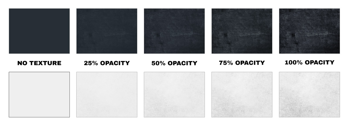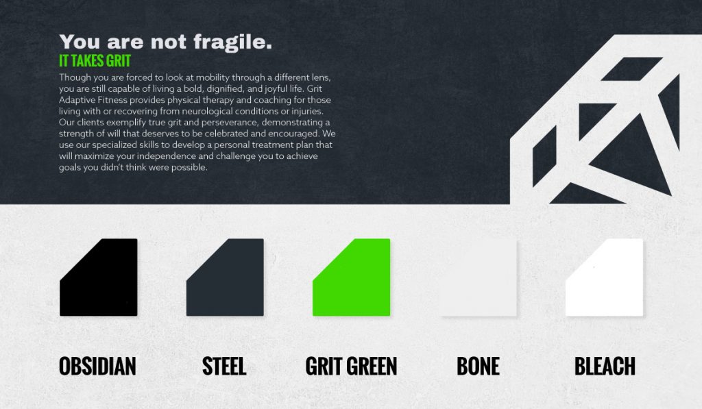 A unique aspect of this brand is the “gritty” textures.” I created high resolution textures to match the color of “Steel” and “Bone” which could then be layered above at different opacities depending on how much text readability was necessary.