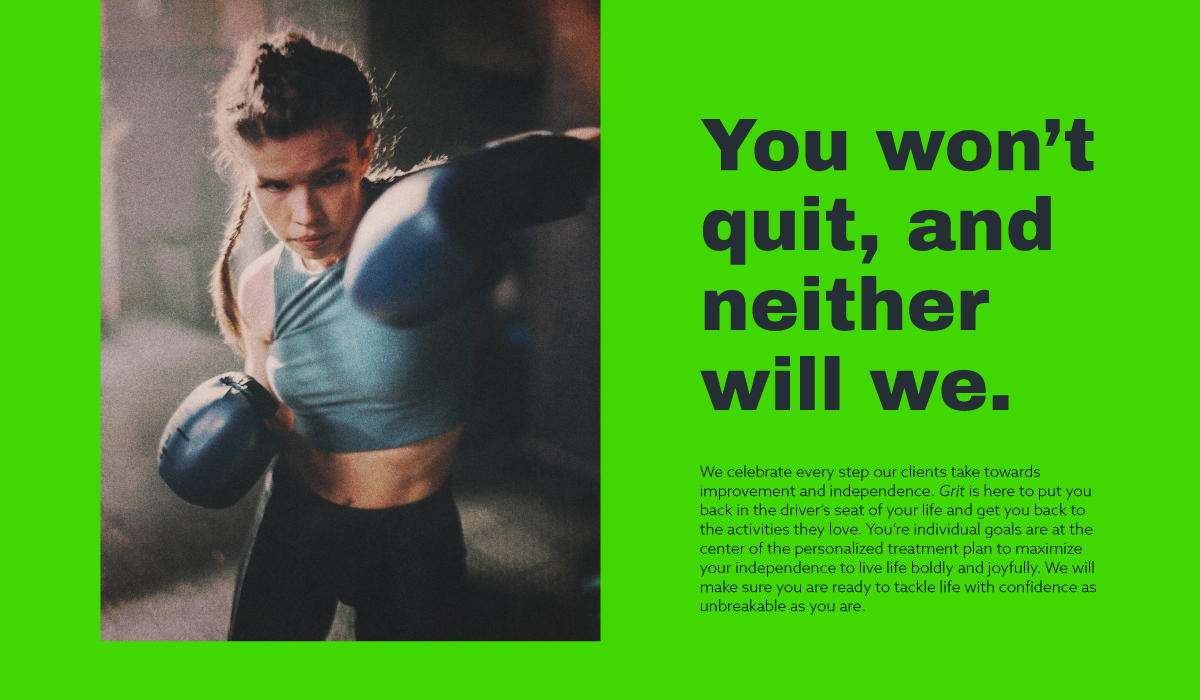 “Our clients exemplify true grit and perseverance, demonstrating a strength of will that deserves to be celebrated and encouraged. We use our specialized skills to develop a personalized treatment plan that will maximize your independence and challenge you to achieve goals you didn’t think were possible. You are not fragile. Even though you are forced to look at mobility through a different lens, you are still capable of living a bold, dignified, and joyful life.”